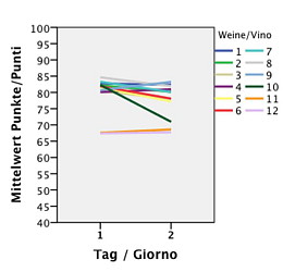 In der letzen Grafik ist der Verlauf der gemittelten Werte dargestellt, d.h. der Durchschnitt aller Koster, welche die Finalweine auch am ersten Tag bewertet haben. Die dramatisch wirkenden oben abgebildeten Einzelergebnisse haben aber keinen solchen Effekt bezüglich des Endergebnises. Wie so oft bei Verkostungen, heben sich durch die Mittelwertbildung die individuell festgestellten Unterschiede ziemlich auf, die Punktezahlen der Weine werden ähnlicher. Tendenziell wurden die Weine im Finale strenger beurteilt als am ersten Tag. Einige Weine erhielten am zweiten Tag so schlechte Benotungen, dass sie – hätten sie die gleichen Punkte am ersten Tag erhalten – sich nicht für das Finale qualifiziert hätten.